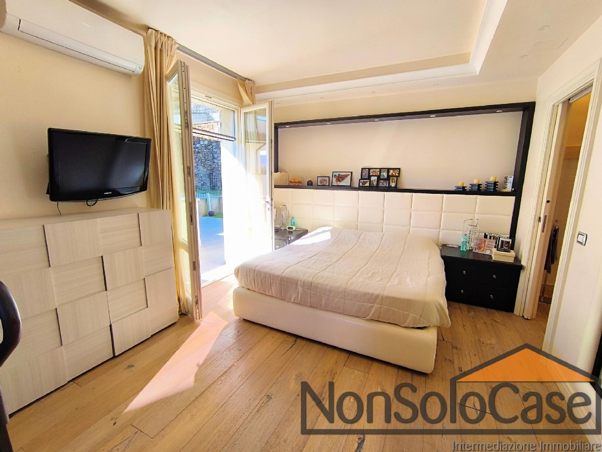 Al piano terra ci accoglie un soggiorno di ingresso e la camera matrimoniale principale con accesso al terrazzo, bagno privato e cabina armadio.